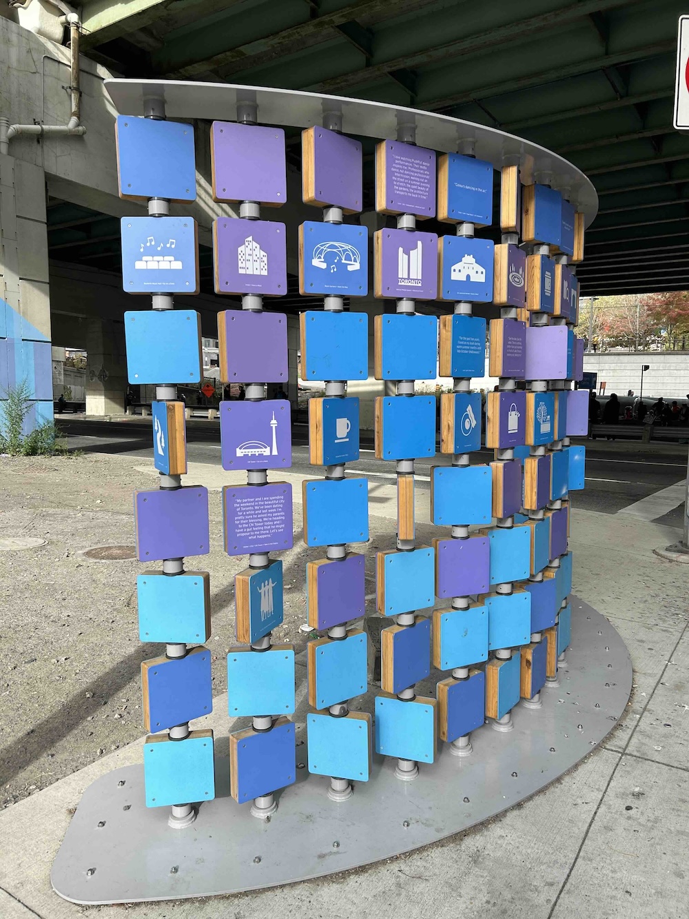 I ran by an installation my sister-in-law worked on. It is located under an elevated expressway (the Gardiner Expressway) that is generally not pleasant to walk through so it's nice to have something interactive to brighten up the concrete.
