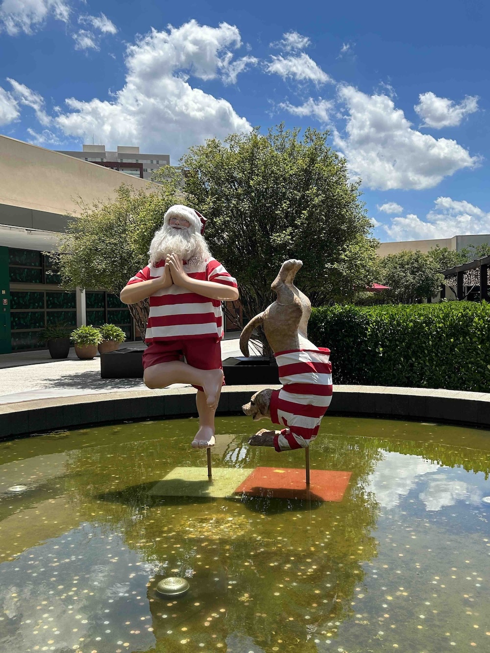 I visited Renato's parents in Brazil during the holidays. One day we went to a mall to watch Wonka (the only show playing in English). There was a santa fountain outside. I thought it was funny to see santa in t-shirt and shorts.